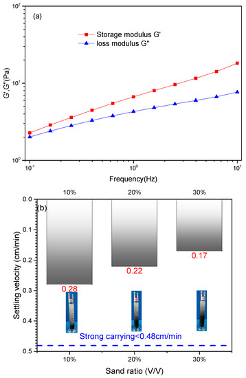 Measuring the settling velocity of sand in fracturing fluid is a simple method which can be used to evaluate the carrying capacity of a fracturing fluid. It is accepted that a settling velocity that is lower than 0.48 cm/min signifies strong sand carrying capacity of fracturing fluids [50]. The results in Figure 9b show that the settling velocities of ceramsite in the PAMNM fracturing fluids are below 0.48 cm/min regardless of the proppant concentration.