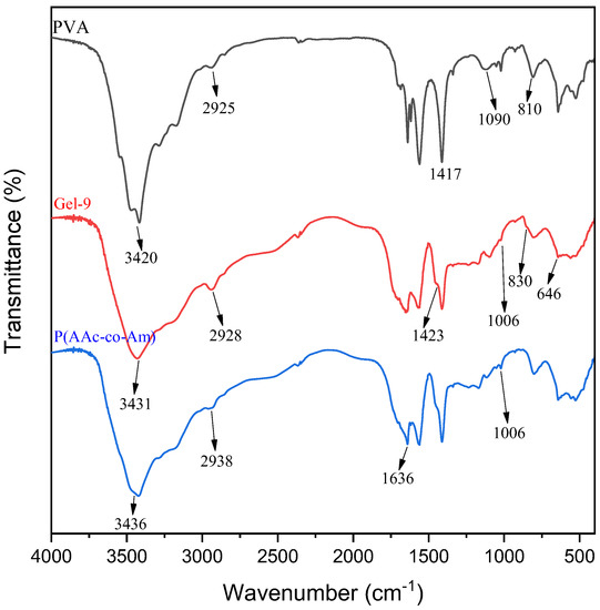 Fourier transform infrared spectroscopy (FT-IR) spectra of PVA, P(AAc-co-Am) and P(AAc-co-Am)/PVA double network hydrogel (Gel-9).