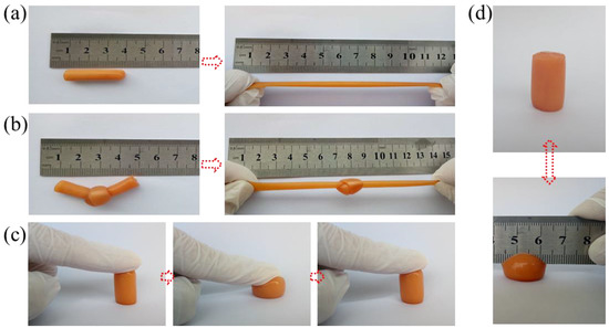 Poly(acrylic acid-co-acrylamide)/poly(vinyl alcohol) double network hydrogels exhibit excellent mechanical properties that can withstand various deformations, as shown in Figure 2. It can be observed that the cylindrical sample could be easily stretched to 300% of their original length without breaking, and the knotted sample could be stretched (as Figure 2a,b). The cylindrical sample could self-recover to its origin height after removing the applied force, as in Figure 2c. We also found that the hydrogel could recover its original shape without any damage under a sharp blade compression. These phenomena indicate that the synthesized hydrogels possess outstanding toughness and self-recovery properties. Hydrogels are hydrophilic materials composed of water and polymer networks, so their mechanical properties are directly related to water content [31]. One of the important applications of hydrogel materials is tissue engineering. However, for human tissue, its water content is about 70%. Therefore, in this study, the water content of the synthesized P(AAc-co-Am)/PVA double network hydrogels is controlled at ~70% (as listed in Table 1).