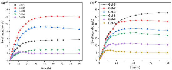 Swelling behaviors of the synthesized double network hydrogels were also investigated in phosphate buffer solution (pH = 7.4, I = 0.1) at 37 °C, and the swelling ratios as function of time are shown in Figure 3. It is clear that all samples can reach the equilibrium swollen state after immersing for 72 h, and the swelling ratio is closely related to the hydrogel composition. As in Figure 3a, the swelling ratio first increases and then decreases with increasing of the content of Am. Swelling ratio of hydrogel with 30% of Am reaches the maximum (about 30 g/g). This is because a non-ionic hydrophilic groups (–CONH2) is introduced into the gel network, and the -CONH2 has a low ionization degree in a near neutral environment [38]. This would result in a certain resistance of the gel to salty in the buffer solution. While an increase in the content of Am causes a decrease in the AAc content, resulting in a decrease in the electrostatic repulsion caused by –COO− groups [39]. The influence of the Fe3+ concentrations on swelling ratios is displayed in Figure 3b. With increasing of the Fe3+ concentrations, the swelling ratio obviously decreases, and the time required to reach the swelling equilibrium becomes shorter. This is mainly attributed to the cross-linking of Fe3+. The increase Fe3+ concentration leads to the formation of more coordination interactions, which restrain the swelling capacity of hydrogels. And the coordination interactions between Fe3+ and –COO− groups consume carboxyl anions, which weakens the electrostatic repulsion between the polymer segments. This is another reason for the decrease in swelling ratios of PVA/poly(acrylic acid-co-acrylamide) double network hydrogels. A similar result has been reported by in the system of PAAc-Fe3+/CNC hydrogels [16].