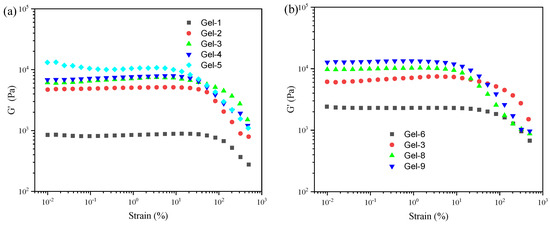The storage modulus (G′) as function of strain for poly(acrylic acid-co-acrylamide)/poly(vinyl alcohol) double network hydrogels are shown in Figure 4. It is clear that all samples displayed a typical elastic response [16,18]. The G′ of DN hydrogels are independent of the applied strain when the strain is lower than the certain value (γc), revealing a viscoelastic solid. The G′ values gradually decrease above the certain value. This indicates that DN hydrogels undergoes a transition from the quasi-solid state to a quasi-liquid state. As shown in Figure 4a, with increasing of the Am contents, the G′ of DN hydrogels increases, while the corresponding γc decreases. This indicated that the increased Am contents improve the stiffness, but reduce the ability to sustain larger deformation [31]. It can be observed in Figure 4b that the G′ of DN hydrogel increases as the Fe3+ concentrations increases, but the corresponding γc decreases. This reveals that the increased Fe3+ concentrations increase the stiffness of the DN hydrogels, leading to the decreasing of the ability to maintain larger deformation. This is attributed to the cross-linking density increased by ionic coordinates between Fe3+ and –COO−. To ensure that the dynamic oscillatory deformation was a linear viscoelastic region, a strain (γ = 1%) was selected in the following oscillation tests.