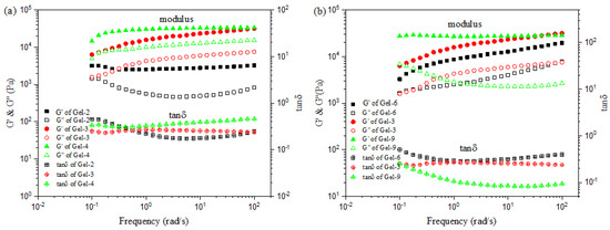 To further explain the influence of the composition on the viscoelastic properties of P(AAc-co-AM)/PVA DN hydrogels, oscillatory measurements were performed at 37 °C, as shown in Figure 5. It is clear that the storage modulus (G′) is larger than the loss modulus (G′′) under all frequency range, and the moduli are significantly weak dependent on the frequency. This is a characteristic of a solid-like viscoelastic behavior [40,41]. It is well known that the storage modulus can be used to evaluate the extent of gel network formation. The higher storage modulus of the gel, the stronger is gel intensity [42]. As in Figure 5a, when increasing the Am content, the G′ and G′′ obviously increases. The possible reason for this is that the increased Am content leads to the formation of hydrogen bonding between –COOH and –CONH2, improving the cross-linking points in the poly(acrylic acid-co-acrylamide) network. It is also observed that Tanδ = G′′/G′ blow 0.40 reveals weak dependency on the frequency. Figure 5b shows the G′ and G′′ of hydrogels with different Fe3+ concentration as a function of frequency. It can be found that the G′ of hydrogels increases as the Fe3+ concentration increases, while the G′′ first increases and then decreases. Tanδ = G′′/G′ below 0.45 shows also weak dependency on the frequency. A similar phenomenon has also been reported by Hussain et al in the hydroxyethyl cellulose/P(AAc-co-Am)-Fe3+ hydrogels [43].