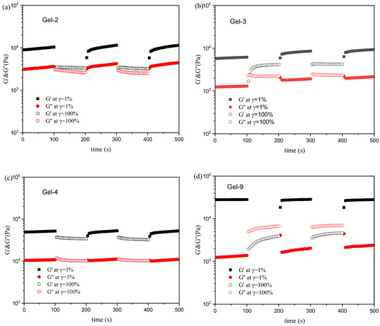Alternate step strain test with small strain to subsequent large strain with 100 s for every strain interval at fixed angular frequency (10 rad/s) at 37 °C: (a) Gel-2; (b) Gel-3; (c) Gel-4; (d) Gel-9