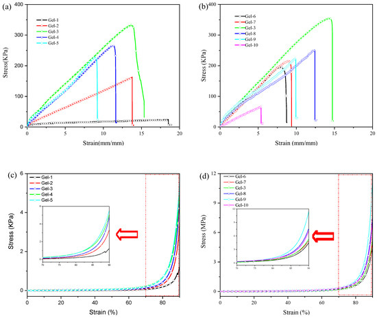 Tensile stress-strain curves (a,b) and compressive stress-strain curves (c,d) of P(AAc-co-Am)/PVA double network hydrogels: (a,c) hydrogels with various Am/AAc ratios; (b,d) hydrogels with various Fe3+ concentrations.