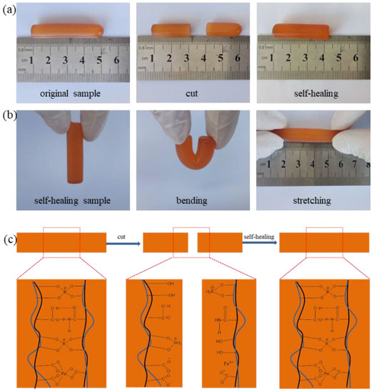 During the experiment, we found that the prepared poly(acrylic acid-co-acrylamide)/poly(vinyl alcohol) double network hydrogels not only present highly stretchable and resilient properties, but also show the certain self-healing capacity. As shown in Figure 8a, a cylindrical sample was cut into two sections. When the freshly fractured surfaces contact, two sections can merge to form a single, cylindrical sample. The self-healed samples can undergo significant deformation, as displayed in Figure 8b. These phenomena revealed that the synthesized P(AAc-co-Am)/PVA double network hydrogels presents good self-healing performance, which is mainly assigned to the special chemical structures. As shown in Figure 8c, the self-healing capacity of P(AAc-co-Am)/PVA double network hydrogels are mainly due to complexation reaction between borate ion and two di-ol units in PVA chains, electrostatic interaction between carboxyl anion and Fe3+ and hydrogen bonding between carboxyl and amide groups, which are dynamically reversible bonds [46,47,48,49]. When samples were cut in half, these bonds were damaged. However, the halves were in contact, the carboxyl anion and Fe3+ could produce electrostatic interaction, accelerating the integration of two halves. Simultaneously, complexation reaction between borate ion and two di-ol units in PVA chains and hydrogen bonding between carboxyl and amide in the inter-interface formed again. These reversible bonds together maintain and improve the self-healing capacity of poly(acrylic acid-co-acrylamide)/poly(vinyl alcohol) double network hydrogels.