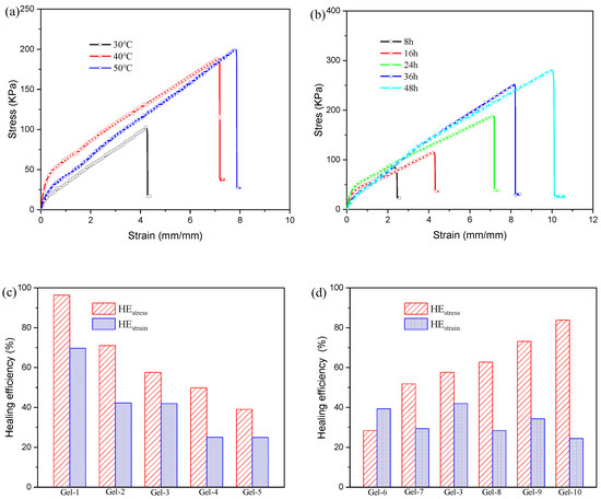 Tensile stress-strain curves (a,b) of healed sample Gel-3: (a) various self-healing temperatures; (b) various self-healing times; Healing efficiency (c,d): (c) hydrogels with different Am/AAc ratios; (d) hydrogels with different Fe3+ concentrations.