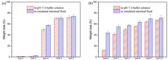 The biodegradability of hydrogels has an important influences on applications in biomedicine and tissue engineering. Therefore, the degradation properties of P(AAc-co-Am)/PVA DN hydrogels were also investigated, and the obtained results are displayed in Figure 10. As in Figure 10, the weight loss in phosphate buffer solution (pH = 7.4, I = 0.1) is significantly less than that of the simulated intestinal fluid. The simulated intestinal fluid contains trypsin compared to the phosphate buffer solution, suggesting that trypsin promotes the degradation of P(AAc-co-Am)/PVA DN hydrogels. However, the mechanism of the influence of trypsin on the degradability of P(AAc-co-Am)/PVA) double network hydrogels is still unclear, and it needs further research. Figure 10a shows the weight loss after the degradation of P(AAc-co-Am)/PVA DN hydrogels with various Am/AAc ratios. It is clear that the weight loss of Gel-1 and Gel-2 is less than 3%, which may be related to the high AAc content. Sun et al [50] reported the analogical result that the PAAc hydrogel is difficult to degrade by buffer solution and enzymes. By increasing the Am content, the weight loss significantly increases. For DN hydrogel with 90% of Am content, the weight loss in phosphate buffer solution and simulated intestinal fluid could reach 70% and 74%, respectively. Figure 10b displayed the influences of Fe3+ concentrations on degradation properties of P(AAc-co-Am)/PVA) DN hydrogels. By increasing the Fe3+ concentrations, the weight loss is enhanced. For P(AAc-co-Am)/PVA) DN hydrogels with 0.30 mmol Fe3+, the weight loss in phosphate buffer solution and simulated intestinal fluid are 66% and 71%, respectively. It can be also found from Figure 10b that the weight loss of the sample with lower Fe3+ concentrations in the simulated intestinal fluid is much larger than that of phosphate buffer solution, and the difference decreases as the Fe3+ concentration increases. This is because the network based on poly(acrylic acid-co-acrylamide) and Fe3+ not only exists the ionic coordination between –COO– and Fe3+, but has the hydrogen bonding between –COOH and –CONH2. The hydrogen bond is weak with respect ionic coordination. This result reveals that trypsin at the simulated intestinal fluid has different ability to degrade ionic coordination and hydrogen bond.