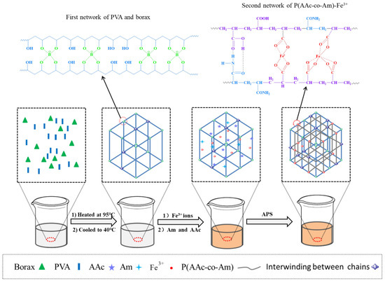 The formation mechanism of poly(acrylic acid-co-acrylamide)/poly(vinyl alcohol) double network hydrogels are displayed in Scheme 1. Firstly, PVA was dissolved in the borax aqueous solution at 95 °C. During the experiment, we found that the fluidity of the solution was getting worse and the white analogous hydrogel formed as the temperature decreased. This is attributed to the formation of a network structure of PVA and borax, which is a reversible crosslinking reaction. The crosslinking mechanism of borate ion with PVA chains was known to be a “di-ol” complex, which was formed between one borate ion and two di-ol units [31,32]. When the temperature was cooled to 40 °C, Fe3+ ions aqueous solution is added. The phenomenon reveals that the incorporation of Fe3+ ions improves the fluidity of the mixture, indicating that the part of crosslinking points of the borate ion with PVA chains is damaged. This also demonstrates that the formed bond of the borate ion with PVA chains is reversible. Next, acrylic acid and acrylamide were added, and the APS aqueous solution was added to initiate the polymerization of AAc and Am monomers. This would form the linear poly(acrylic acid-co-acrylamide) macromolecular chain with pendant carboxyl groups and amide groups. The coordination between Fe3+ ions and carboxyl groups could play a role of cross-linking point, resulting in the formation of ionic cross-linked network based on poly(acrylic acid-co-acrylamide). While the hydrogen bonding force may be also form between the pendant carboxyl group and amide group. Therefore, a double network hydrogel based on PVA and poly(acrylic acid-co-acrylamide) was synthesized. In the double network structure, the first network based PVA and borax and the second network based poly(acrylic acid-co-acrylamide) and Fe3+ ions are dynamically reversible. These structures endow the poly(acrylic acid-co-acrylamide)/poly(vinyl alcohol) double network hydrogels with excellent mechanical strength and self-healing properties.