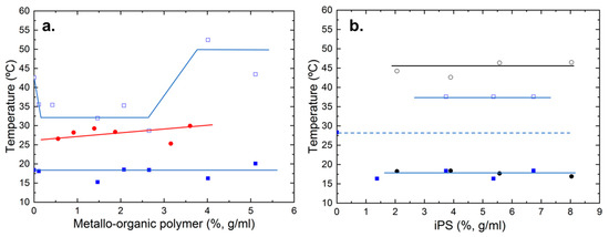 24]. Additionally, it was determined that the physical gel formation was induced by the crystallization of the metallo-organic polymer chains. For the hybrid gel (with a fixed iPS content of 4 g/mL), two different sets of points are represented, each set corresponding to the first and third endothermic peak observed in the thermograms (