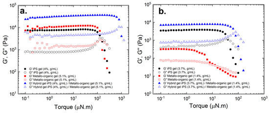 Figure 3a,b, the evolution of storage G’ and loss modulus G’’ with the oscillation torque is described for pure iPS gels, pure metallo-organic polymer gels, and for hybrid iPS/metallo-organic polymer gels. The three gels describe a common rheological comportment showing G’ higher than G’’, which is indicative of a solid-like behavior. G’ and G’’ show a plateau up to a critical torque value where both moduli decrease abruptly and crossover modulus (G’ = G’’). The decreasing and crossover of both moduli entails the transition from a solid-like to liquid-like behavior. From these graphs, we could also determine the linear viscoelastic regime (LVR) where the values of G’ and G’’ are independent of the applied torque [