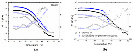 Figure 4a,b, the evolution of storage and loss modulus with temperature for the pure iPS gel and hybrid iPS/metallo-organic polymer gels is represented. If we focus on the temperature dependence of iPS (