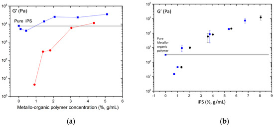 Figure 5a, we have represented the equilibrium storage modulus G’ as a function of metallo-organic polymer concentration for hybrid gels with fixed iPS concentration (4%, g/mL) and for pure metallo-organic polymer gels. As it can be observed, the equilibrium storage modulus of pure metal-organic polymer gels increase with concentration; besides, the value of storage modulus appears to be above the equilibrium storage modulus of the pure iPS gel of 4% (g/mL) at a concentration of metal-organic polymer close to 3.6% (g/mL). In the case of the hybrid gel (with fixed iPS concentration), the equilibrium storage modulus decreases up to a concentration of 0.5% (g/mL), from which it begins to increase, ending at a value that is higher than the one shown by pure iPS gel (4%, g/mL) above a metallo-organic polymer concentrations of 1% (g/mL). The equilibrium storage modulus of the hybrid gels is always higher than those of the pure metal-organic polymer gels with the same metallo-organic polymer concentration. However, the equilibrium storage modulus of the hybrid gels with metallo-organic polymer concentrations below 1% (g/mL) are lower than the equilibrium value of the pure iPS gel of 4% (g/mL). At such low concentrations (>1%, g/mL), the metallo-organic polymer is not able to form gel on its own, furthermore preventing the gelation of the iPS. This could be explained by a hindrance of the rigidification of the iPS chains or a process of dilution of the iPS in the mixture because of the presence of metallo-organic polymer. When the concentration of metallo-organic polymer in the hybrid gel is enough for the its gelation to take place, then the equilibrium storage modulus increases. This augment could be due to the formation of an interpenetrated network of iPS and metallo-organic polymer gels.