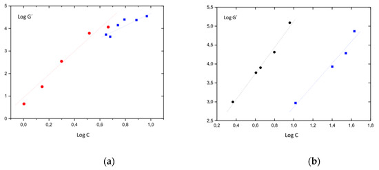 15]. Since the storage modulus of the studied gels describe two pseudo-equilibrium moduli where G ≠ G(T), it is possible to indicate that the obtained gels are formed by networks presenting enthalpic elasticity. For this type of network, there is an approximation that correlates the equilibrium storage modulus with the concentration through the fractal dimension (υ-1) of the objects linking the connection points: G α C