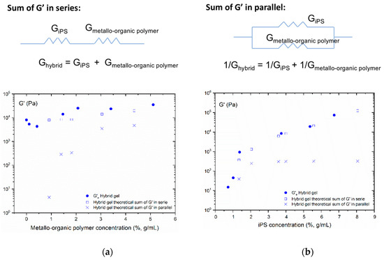 Figure 7a,b, experimentally obtained equilibrium storage moduli of the hybrid gel are compared with the values determined through the application the two theoretical models from the experimental data. As concluded from both graphs, the theoretical model that best describes the experimental elastic behavior of the hybrid gel is the one that considers the elastic behavior of the hybrid gel as the sum of individual gel’s storage modulus in series. That is, the hybrid gel would consist of two networks of pure polymers independent of each other.