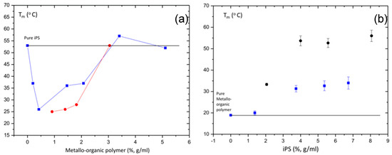 Figure 8a, we have collected the melting temperatures (Tm) obtained for pure metallo-organic polymer gels and iPS/metallo-organic polymer hybrid gels with a fixed iPS concentration of 4%, g/mL and represented as a function of metallo-organic polymer concentration (%, g/mL). From the figure, we observe how the melting temperature values of the metallo-organic polymer gels increase with the concentration in the studied range of concentrations. In contrast, the melting temperatures of the hybrid gels decreases up to a concentration of metallo-organic polymer of 0.4%, g/mL; beyond this concentration, the melting temperatures increase to values slightly above the pure iPS gel of 4% (g/mL). The melting temperatures of the hybrid gels are lower than those of the pure iPS gel (4%, g/mL) in almost the entire range of metallo-organic polymer concentrations. Therefore, at low metallo-organic polymer concentrations, dilution phenomena may occur, preventing the gelation of the iPS, which causes the melting temperature of the hybrid gel to decrease. This confirms the idea of the formation of the hybrid gels, from the gelation of both iPS and metallo-organic polymers independently, as long as the two polymers are in concentrations above the critical gelation concentrations.