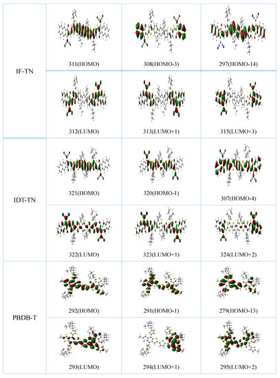 It can be seen from Figure 2 that the electron clouds of the HOMOs of the NFAs IF-TN and IDT-TN are more concentrated near the IF (the red box portion in Figure 1) and IDT (the blue box portion in Figure 1) regions. The LUMOs are more concentrated near the N (the black box portion in Figure 1) regions. This describes that the IF (or IDT) and N have stronger electron-withdrawing abilities and hole-withdrawing abilities, respectively, compared to other parts of the NFAs. However, the IDT-TN has a stronger electron-withdrawing ability relative to IF-TN because of the structure of the electron-donating core units. Therefore, the electrons are transferred from the N to the IF (or IDT) region when the NFAs are stimulated by sunlight, and among the two systems, the IDT-TN is the better NFA because the IDT region can attract more electrons.