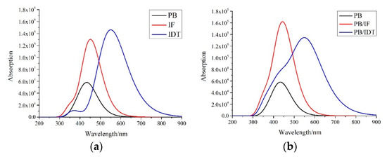 As shown, for the NFAs IF-TN and IDT-TN, and donor PBDB-T, the strongest absorption state (where the oscillator strength f is largest) is the S1 excited state, which is the electron transfer from the HOMO to the LUMO level. The oscillator strength f of the S1 state and the excited-state lifetime τ are better for the NFA IDT-TN than for IF-TN. Therefore, IDT-TN has the obviously red-shifted absorption spectra and excitons staying in excited state for longer times. It can be seen from Figure 3a that the absorption peak of IDT-TN has an obvious red-shift relative to IF-TN, and IDT-TN also has the broader absorption spectra. The absorption peaks of S1 of the interfaces PB/IF and PB/IDT are 456.23 and 558.31 nm, respectively. The oscillator strengths are 2.1406 and 3.1576, respectively. The LHEs are 0.993 and 0.999, respectively. For the interfaces PB/IF and PB/IDT, the strongest absorption state is also the S1 excited state. Nevertheless, the electron transfers are from the HOMO-2 to LUMO levels or HOMO-1 to LUMO levels, respectively. The interface PB/IF has the larger oscillator strength f of the S1 state and LHE compared to PB/IF. It can be seen from Figure 3b that the interface PB/IDT has the obviously red-shifted absorption peak compared to PB/IF, and the PB/IDT also has the wider and stronger absorption spectra.