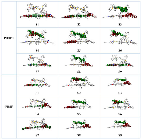 The charge difference densities (CDD) are analyzed and calculated in order to make the electron transfer processes of the NFAs and between donors and acceptors clearer and more intuitive [58]. As shown in Figure S1, for the NFAs IF-TN and IDT-TN, and donor PBDB-T, it can be seen that there are more electrons localized on the structures of electron-donating IDT core units of the NFA IDT-TN. For the interface PB/IF, it can be seen from Figure 4 that for the S1, S4, and S7 states, all electrons and holes are located on the NFA IF-TN. For the S2 and S6 states, all electrons and holes are located on the donor PBDB-T, while for the S3, S5, S8, and S9 states, electrons and holes are completely separated and distributed on the NFA and the donor, respectively. The S3 state is the minimum charge state, and the charges are completely separated at the PB/IF interface. When all electrons are located on the NFA IF-TN, the electrons are mainly located on the structures of electron-donating IF core units. For the PB/IDT interfaces, it can also be seen from Figure 4 that for the S1, S2, S7, and S9 states, all electrons and holes are located on the NFA IDT-TN. For the S4 and S6 states, all electrons and holes are located on the donor PBDB-T, while for the S3, S5, and S8 states, electrons and holes are completely separated and distributed on the NFA and the donor, respectively. The S3 state is viewed as the minimum charge state, and the charges are completely separated at the PB/IDT interface. When all electrons are located on the NFA IDT-TN, the electrons are mainly located on the structures of electron-donating IDT core units. Thus, it can be seen that the strongest absorption states are the S1 excited states for both PB:IF and PB:IDT active layers, and that the NFAs play key roles in absorbing sunlight.