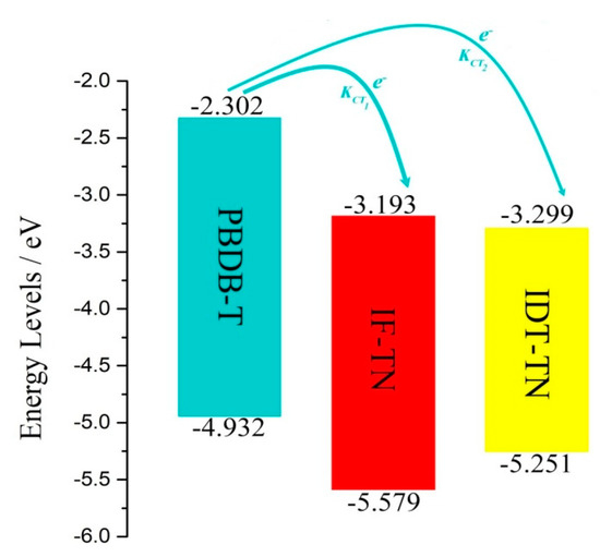 Electron affinities (EAs) and ionization potentials (IPs) can be used to evaluate the degrees of difficulty of hole–electron binding and molecular ionization, respectively, which also represent the electron and hole barriers in the electron transport of the PSCs. Higher EAs and lower IPs can facilitate the injection of electrons and the separation of excitons, respectively [47,48]. The EAs and IPs of the NFAs IF-TN and IDT-TN, and donor PBDB-T are shown in Table 2, in which the EAs of the NFAs IF-TN and IDT-TN, and donor PBDB-T are 2.533, 2.666, and 1.482 eV, respectively, and the IPs are 6.272, 5.912, and 5.702 eV, respectively. The NFA IDT-TN has a higher EA and lower IP relative to IF-TN. Therefore, the PSC PB:IDT has a better efficiency of electron injection and exciton separation.