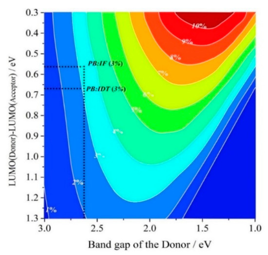 For the power conversion efficiency (PCE), the Scharber diagram (by the contour lines and colors) is used to estimate the specific value of the PCE [83,84]. The Scharber diagram can be seen in Figure 6, and the PCE values of the PSCs PB:IF and PB:IDT are both 3%. Although the PSC PB:IF may have a higher VOC and FF0, the PSC PB:IDT has the wider, stronger, and more red-shifted absorption spectra, larger LHE, longer excited-state lifetime, higher voltage loss, and larger electron mobility. It is hoped that on the same order of magnitude for VOC and FF0, the PSC based on PB:IDT has the bigger external quantum efficiency (EQE) and short-circuit current (JSC), which should lead to a better PCE.