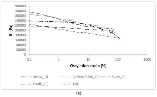 The vulcanizates filled with silica and carbon black showed a larger G′ modulus at small strain, and the beginning of deformation of the filler network started earlier than the other fillers (Figure 1). In the case of straw, the course of the storage module curve was gentle, while the beginning of the deformation was observed at higher strain values, similarly to chalk and talc. During the destruction of the filler structure, the rubber associated with the elastomer matrix is released, which reduces its effective volume. This phenomenon is depicted in the form of a decrease in the modulus of elasticity. The lowest decrease in G′ values as a function of strain was observed in composites containing chalk and talc. The course of the storage module curve for composites filled with straw was similar to the vulcanizates with the addition of carbon black, which is considered a typical semi-reinforcing filler. Therefore, improvement of functional properties in composites made with the use of cereal straw is expected. However, the excessively high Payne effect (occurring for silica composites at higher contents) could be associated with a high tendency of the filler to agglomerate and aggregate in the polymer matrix, which negatively affects the properties of the composite [29]. The more agglomerated the filler, the higher the amount of rubber occluded into the aggregates, resulting in a greater hydrodynamic effect, which reduces filler-matrix interactions.