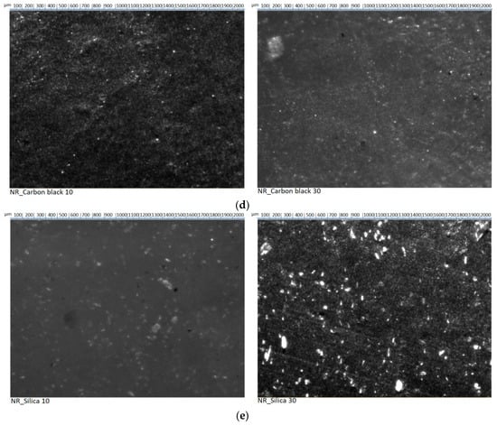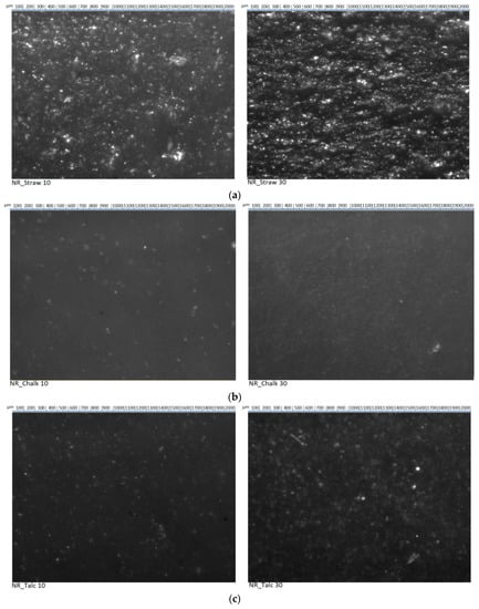 The straw particles in the elastomer matrix exhibited a uniform distribution in the composite (Figure 2). However, their size was much larger compared to other fillers. Based on observations of images, it could be seen that the straw particles were different in size and shape but did not form agglomerates or aggregates. Increasing the content of lignocellulosic material to 30 phr did not adversely affect the distribution of particles in natural rubber. Definitely, the largest tendency for agglomeration was observed in the case of the application of nanosilica. Obtaining the appropriate degree of dispersion of the filler in the elastomer matrix was necessary both from the point of view of the macroscopic homogeneity of the material and the effectiveness of its reinforcing effect. Filler dispersion was a critical factor in determining the properties of filled rubber composites. Silica has a high density of silanol groups on the surface, which lead to strong filler–filler interactions and poor filler dispersions. The remaining fillers, similar to straw, were characterized by homogeneous distribution in the polymer matrix.