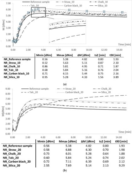 The nature of the vulcanization process of mixtures containing straw was similar to composites filled with carbon black, talc, and chalk (Figure 4). These materials were characterized by a so-called plateau curve, while in the case of silica, the so-called curve with a marching module.