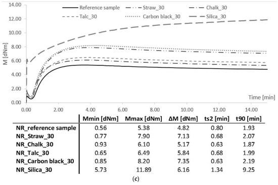 Rheometric properties and vulcanization parameters of elastomer mixtures filled with (a) 10 phr, (b) 20 phr, and (c) 30 phr.