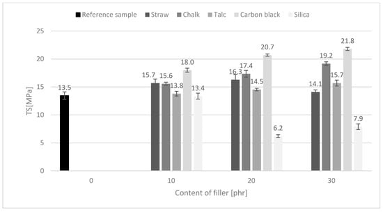 In addition, the tensile strength of composites containing 10 and 20 phr of straw oscillated at a comparable level to materials filled with commercially used chalk (Figure 5). It was higher than composites containing talc or nanosilica, which were already agglomerated at this content. However, the reduction of TS values for straw-based composites was observed at 30 phr. The decrease in the tensile strength and elongation of the vulcanizates could be caused by the fact that the short fiber with a high content influenced the increase of the shear forces during the stretching of the rubber macromolecules, thus reducing the mechanical strength of the vulcanizates [30]. Furthermore, the tensile strength of the polymers remains in close dependence on the adhesion between the filler and the medium as well as the mechanism of stress transfer in the filler-polymer system. As can be seen from the above-mentioned measurements of the crosslinking density, composites containing straw showed a significant degree of υe value. It is known that sites with higher crosslinking density and thus less mobility of polymer chains cause stress accumulation resulting in lower tensile strength.