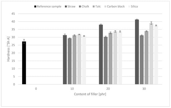 Measurement of the absorbance of dibutyl phthalate through the filler is an indirect measure of its activity providing information on the structure and porosity of the tested additive. The highest value of absorbed dibutyl phthalate was noted for silica (Table 1). The obtained result indicated that the filler was characterized by the most developed surface and the highest porosity and volume of free spaces between the aggregates of particles. This meant that the silica particles would probably show an enhanced ability to form their own “network” in the elastomeric medium. An excessively well-developed secondary filler structure in the polymer leads to the formation of agglomerates and aggregates, negatively affecting the properties of composites. The high DBPA value was also characterized by straw; its value (140 mL/100 g) was significantly higher than the other tested fillers. The structure is one of the factors affecting the so-called strengthening effect, characteristic for the group of active and semi-active fillers. Therefore, in the case of bio-composites filled with straw, improvement in strength properties could be expected.