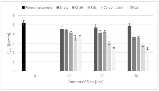 All tested composites, regardless of the filler used, showed a decrease in tear resistance (Figure 7). The tear strength of composites ranged from 4.9 to 2.5 N/mm for NR_30 straw and NR_30 silica, respectively. The obtained values were lower than the strength of the reference sample (5.2 N/mm). Application of the lignocellulosic filler resulted in a reduction of the Fmit value to the smallest extent. The key aspect could be its morphology; the straw has a fibrous shape and the remaining fillers resemble spherical particles. The short fibers could be aligned along the direction of loading, which was perpendicular to the direction of tear propagation. Therefore, the short fibers transferred stress around and prevented crack growth. The concentration of straw increased tear strength by obstructing the tear path. A similar effect was observed by Kalaprasad [31].