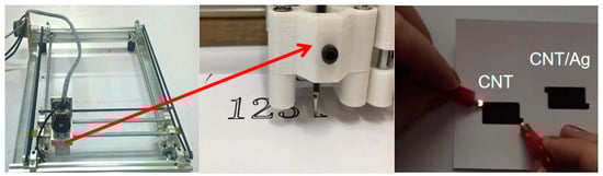 Carbon-based materials have become attractive nanomaterials in various applications due to their unique properties []. A carbon-based nanotube (CNT) has a unique hollow structure, a high specific surface area, mechanical flexibility, a high stability, and a low cost, and it is suitable for electrolyte ion migration pores. Its use as an electrode material can significantly improve the power characteristics and frequency response characteristics of supercapacitors. Additionally, supercapacitors using carbon material-based materials mainly rely on the electrical double layer capacitor (EDLC), exhibiting fast charge-discharge times and surface-area-dependent capacities [,,]. At present, many studies are devoted to the study of conductive patterns in carbon nanotube printing [,,]. However, the printed carbon nanotubes have an overly high resistance on flexible substrates and cannot be widely used in optoelectronic devices [,].
