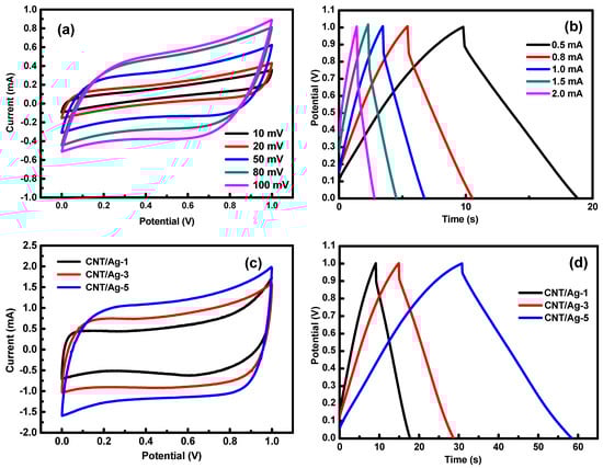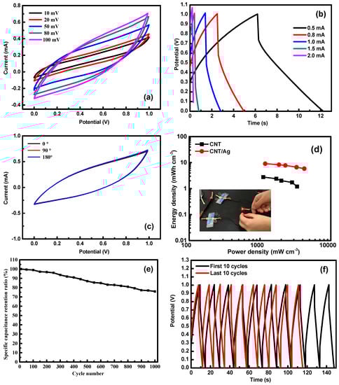 The CNT/Ag composite papers could be directly used as electrodes for a flexible solid-state supercapacitor (FSC) because they possess flexibility and low sheet resistance. As a proof of concept, we used two identical CNT/Ag-5 electrodes for the assembled supercapacitors, and the performance is depicted in Figure 4a. Figure 4a shows that the CV curves displayed no obvious distortion in the shape at a high scan rate of 100 mV/s. From the GCD curves (Figure 4b), we can determine that the single volumetric capacitance was 17.68 F/cm3 at a current density of 0.5 mA/cm2.