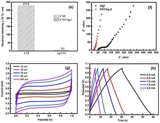 Moreover, the electrodes doping Ag exhibited a larger volume specific capacitance than CNT electrodes under the same voltage sweep speed (Figure 3a,c). The GCD curves of the CNT/Ag electrodes with different Ag doping doses at a current density of 0.5 mA/cm2 are shown in Figure 3d. It can be observed that as the Ag doping dose increased from 1 to 5 wt %, the charge and discharge time of CNT/Ag electrodes increased, and the iR drop decreased. This appearance indicates an increase in the capacitance of the CNT electrode after Ag doping. The volumetric capacitances for the 1, 3, and 5 wt % Ag doping CNT/Ag electrode were 25.7, 37.4, and 72.8 F/cm3, respectively, at a current density of 0.5 mA/cm2, which were much larger than the value of the CNT electrode (25.3 F/cm3). The high volumetric capacitance of CNT/Ag electrodes could be ascribed to the fact that the Ag particles could promote the contact between the electrolyte ions and the electrode surfaces, as well as the enhanced conductivity of the composite electrodes. It was also observed in Figure 3e that the addition of Ag nanoparticles significantly improved the conductivity. The experimental results showed that by doping of Ag conductive phase, the resistivity of the electrode could be 5.1 × 10−4 Ω/cm, which was 98.2% less than the CNT electrode. The main reason for the decrease in resistivity was the excellent conductivity of Ag nanoparticles and the good connection between Ag and CNT. It can be seen from Figure 3f that the equivalent series resistance (ESR) for the CNT/Ag-5 electrode was about 13.4 Ω/cm2, and CNT electrode ESR was 51.7 Ω/cm2. Due to the high conductivity of Ag particles, the iR dropped and was much lower than the CNT electrode. The CV curve of the CNT/Ag-5 electrode under different sweep speeds is shown in Figure 3g. The CNT/Ag-5 electrodes had very symmetrical and nearly rectangular CV curves in a potential window of 0–1 V, indicating that the device also had a excellent capacitance performance. Good linearity of GCD curves with different current densities (Figure 3h) further confirms the good electrochemical behavior of the device.