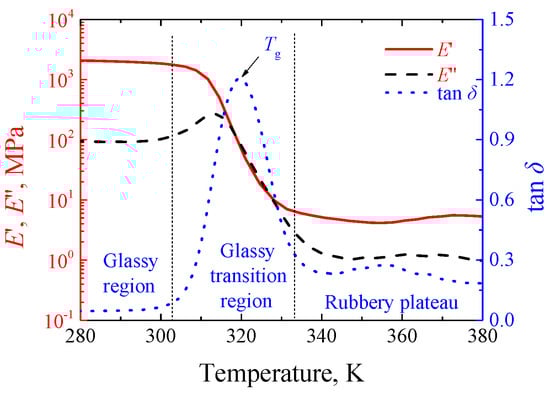 The experimental material was SMPU, numbered as MM4520. The material was purchased from SMP Technologies Inc. in Tokyo, Japan and exhibited shape memory effect similar to that in Reference [2]. Dumbbell specimens were injection molded with the gauge length of 33 mm [3], as shown in Figure 1. The specimens were prepared in a dry environment for experiments. The glass transition temperature of SMPU was obtained by a dynamic mechanical analysis (DMA). The DMA was conducted by a machine of DMA-Q800 (TA® Instruments, New Castle, DE, USA) in a tensile mode with a temperature rate of 2 K/min and a frequency of 1 Hz from 280 K to 380 K. It can be seen from Figure 2 that the glass transition region ranges from 303 K to 333 K and the peak of tanδ approximates 318 K, the storage modulus changes three orders of magnitude in the narrow glass transition region, and SMPU presents a glassy state and a rubbery state below 300 K and above 340 K, respectively. From the storage modulus shown in Figure 2, stable glassy and rubbery plateaus at temperatures below 300 K and above 340 K can be observed clearly, respectively.