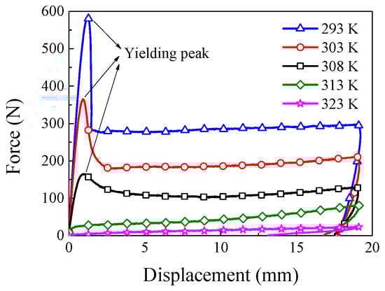 The force–displacement curves at different temperatures with the loading rate of 1 mm/s are shown in Figure 3. It can be seen from Figure 3 that the influence of temperature on mechanical properties of SMPU is obvious, and the yielding peak decreased gradually and vanished finally with the increasing temperature. Since the loss modulus appeared at a peak value near 313 K, as shown in Figure 2, the viscosity was so strong that the unloading curve exhibited a strong nonlinearity. The force response decreased remarkably and the yielding peak disappeared at 323 K since SMPU presented a rubbery state at high temperature [24].