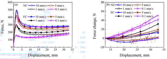 (a) Curves of force and displacement at different loading rates; (b) curves of force change and displacement at the plastic flow stage at different loading rates (symbol ‘×’ denotes the fracture of specimens at the loading displacement).