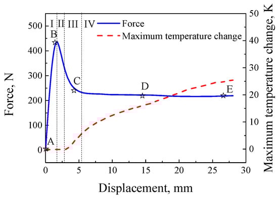 Referring to the method of deformation decomposition proposed by Muhammad and Jar [25], and combining force–displacement curves and temperature change–displacement curves, the loading process can be divided into four parts by three characteristic strains, i.e., the yielding strain, nucleation strain of strain localization and flow strain. The four parts are shown in Figure 5, i.e., I: Elastic deformation, II: Strain softening (from the peak stress to the start of temperature rise), III: Nucleation of localized deformation (from the start of temperature rise to the end of strain softening) and IV: Propagation of localized deformation (from the end of strain softening to the end of loading). Correspondingly, five characteristic points are selected as point A, point B, point C, point D and point E to observe the deformation process, and they present the initial point, peak stress point, end point of strain softening, the middle point of localized propagation and the end point of loading, respectively.