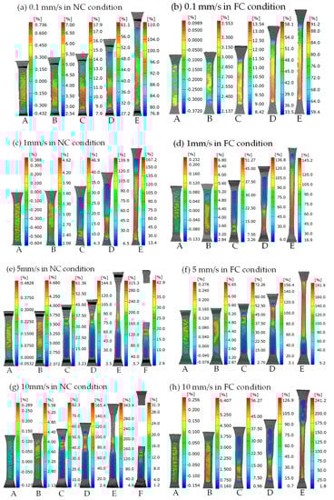 Strain contours at the loading rates of (a) 0.1 mm/s in the natural convection (NC) condition; (b) 0.1 mm/s in the forced convection (FC) condition; (c) 1 mm/s in the NC condition; (d) 1 mm/s in the FC condition; (e) 5 mm/s in the NC condition; (f) 5 mm/s in the FC condition; (g) 10 mm/s in the NC condition and (h) 10 mm/s in the FC condition. (Point F in Figure 6e,g denotes the fracture of the specimen).