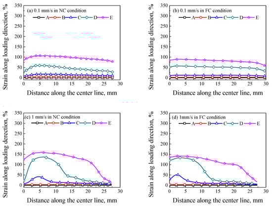 The axial strain along the center line of specimens in Figure 6 is extracted, as shown in Figure 7. In Figure 7a, no obvious strain localization was observed at the loading rate of 0.1 mm/s in the NC condition, i.e., the strain along the gauge section of the specimen was approximately uniform, the deformation presented a uniform elongation mode with a weak localized deformation at point D. Moreover, the deformation in Figure 7b was more uniform than that in Figure 7a. In Figure 7c, an obvious strain localization can be observed at point C, which indicates that the strain localization nucleated from the strain softening (point C corresponds to the strain softening, as shown in Figure 5). As the strain localization increased after point D, the strain localization began to propagate, i.e., the strain localization presented a propagation mode, and the width of deformation region was enlarged from point D to point E. In Figure 7e,g, the plastic flow was accompanied by a sharp peak strain and the peak strain increased with the increasing loading displacement, i.e., the strain localization presented a localized deformation mode. It can be concluded that, the strain localization mode can transform from a uniform elongation mode (loading rate of 0.1 mm/s) to a propagation mode (loading rate of 1 mm/s), and then to a localized deformation mode (loading rate of 10 mm/s) with the increasing loading rate in the NC condition. In Figure 7d, the peak strain increased with the increasing displacement in the FC condition from point C to point D, but the peak strain only extended without significant increase after point D, which presented a propagation mode of strain localization. In Figure 7f, the peak strain extended after point D without a sharp peak strain, which is similar with that in Figure 7c,d rather than that in Figure 7e. In Figure 7h, the peak strain extended and increased after point D, which presented a mixed mode of strain localization and strain propagation. To sum up, the mode of strain localization could be transformed by the increasing loading rate and changing convection condition from NC to FC.