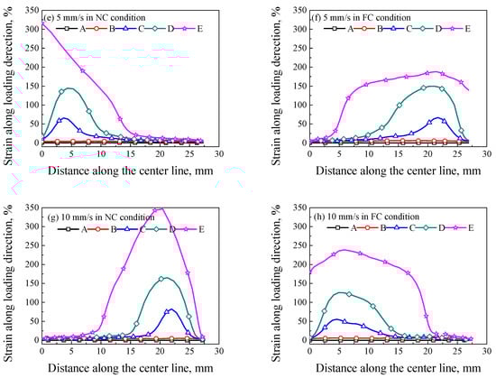 Strains along the center line of specimens at different loading rates of (a) 0.1 mm/s in the NC condition; (b) 0.1 mm/s in the FC condition; (c) 1 mm/s in the NC condition; (d) 1 mm/s in the FC condition; (e) 5 mm/s in the NC condition; (f) 5 mm/s in the FC condition; (g) 10 mm/s in the NC condition and (h) 10 mm/s in the FC condition.