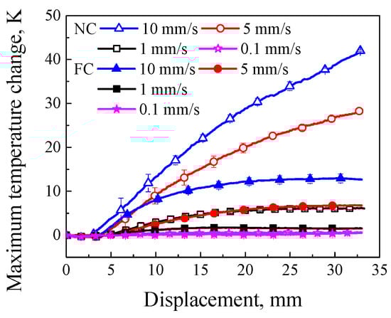 The temperature field can be monitored synchronously by using the FLIR camera during the tensile deformation. The correlations between the maximum temperature change (the current maximum temperature subtract the initial temperature) with error bars and loading displacement are shown in Figure 8. It was found that the maximum temperature change in the FC condition increased with the increasing loading rate, and was less than that in the NC condition at the same loading rate; in the meantime, the slop of maximum temperature change–displacement curve decreased with the increasing loading displacement, especially at a relative low loading rate and in the FC condition, which was the result of a stronger heat exchange with the surrounding environment in the FC condition than that in the NC condition.
