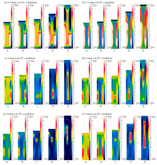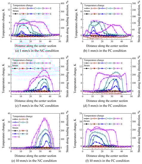 To understand the correlation of strain localization and temperature change, the strain and temperature distributions of the same specimen were compared, as shown in Figure 11a–f. It was seen that the distribution regions of local deformation were similar with those of temperature change at different loading rates, especially that in the NC condition. When the strain localization nucleated from a local region, the temperature localization occurred at the same position, i.e., the temperature distribution changed with the propagation of strain localization. The strain distributions along the center section in the NC condition shown in Figure 11a,c,e were more similar with temperature distribution than those in the FC condition shown in Figure 11b,d,f since the FC changed the heat exchange. For instance, as shown at point E in Figure 11b, the maximum strain distribution was located at the bottom of the specimen, while the maximum temperature was located at the upper part of the specimen. The reason is that the strain at point D in Figure 11b was up to 136.8%, which was close to 145.2% at point E in Figure 11b, i.e., during the deformation from point D to point E, the strain at the bottom of the specimen hardly increased with the increasing loading displacement, but the temperature change decreased obviously due to the heat exchange (see Figure 11b). As a result, the temperature change at the upper part of the specimen increased due to the continuously increasing deformation at point E. A similar phenomenon is observed in Figure 11d. Therefore, the effect of temperature change induced by the internal heat generation on the strain localization can be changed. In addition, it can be seen from Figure 11a,c that the maximum temperature change at the loading rate of 1 mm/s in the NC condition was far less than that at the loading rate of 5 mm/s in the NC condition, but it was similar to that at the loading rate of 5 mm/s in the FC condition shown in Figure 11d, which indicates the temperature change due to the internal heat generation can be changed by the FC condition.