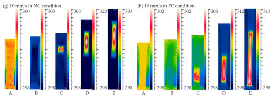Temperature field contours at different loading rates are shown in Figure 9. The picture at point A is the undeformed reference state. It was found that the temperature of point B in all figures was less than that of point A since the elastic deformation decreased the temperature of specimen [1,3]. The following plastic deformation generated the internal heat and resulted in a temperature rise of the specimen, and the temperature rise further promoted the plastic flow, i.e., thermo–mechanical coupling effect [3,18]. In Figure 9a,b, temperature fields present approximately uniform distributions at the loading rate of 0.1 mm/s in the NC and FC conditions; however, temperature fields in Figure 9c–h present obvious temperature localizations at the loading rates of 1, 5 and 10 mm/s in the NC and FC conditions. The temperature rise was generated from a local region and then propagated to its adjacent region with the increasing loading displacement. It is seen from Figure 9a–h that the region of obvious temperature change on specimen surface became smaller and smaller with the increasing loading rate, while the maximum temperature rise increased with the increasing loading rate. In addition, the temperature rise in the FC condition was less than that in the NC condition, and its distribution in the FC condition was wider than that in the NC condition. That is, the convection condition affected the value of temperature change and its distribution remarkably, which is similar with its effects on the strain distribution discussed in Section 3.2.