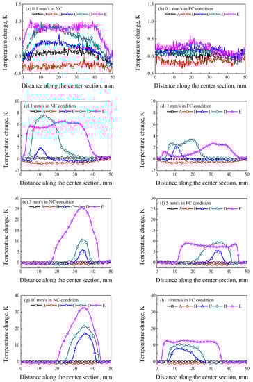 Temperature changes along the center section of specimens at different loading rates of (a) 0.1 mm/s in the NC condition; (b) 0.1 mm/s in the FC condition; (c) 1 mm/s in the NC condition; (d) 1 mm/s in the FC condition; (e) 5 mm/s in the NC condition; (f) 5 mm/s in the FC condition; (g) 10 mm/s in the NC condition and (h) 10 mm/s in FC condition.