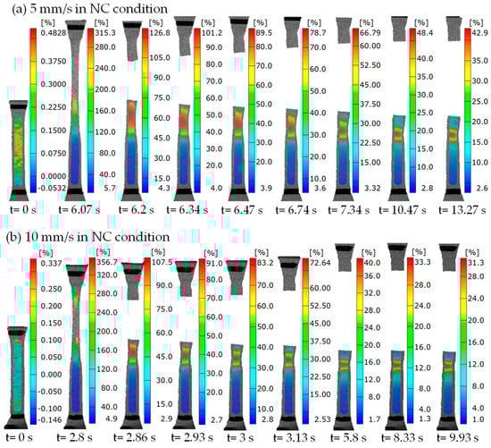 Pictures of strain contours from tension to fracture at different moments with the loading rates of (a) 5 mm/s and (b) 10 mm/s in the NC condition.