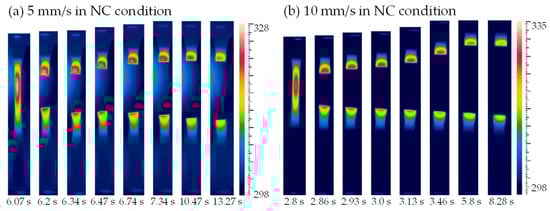 Temperature contours after fracture at different moments at the loading rates of (a) 5 mm/s and (b) 10 mm/s in the NC condition.