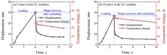 However, it is found from Figure 12 that the local large deformation could be recovered after the specimen fractures, and the unrecoverable strain at the loading rate of 5 mm/s was larger than that at the loading rate of 10 mm/s in the NC condition, it implies the shape memory effect can be activated by the high heat generation, and the recovery capacity of shape memory depends on the loading rate. The temperature contours at different moments after the specimen fractures were captured, as shown in Figure 13. It was seen that the temperature rise decreased gradually, but it was always much higher than the ambient temperature. Comparing Figure 13a,b, it was found that the temperature rise at the loading rate of 5 mm/s was lower than that at the loading rate of 10 mm/s due to a longer time to conduct heat exchange at a lower loading rate. To quantitatively indicate the relationship between the shape recovery and temperature rise, the curves of displacement and temperature change with time at the loading rates of 5 mm/s and 10 mm/s in the NC condition are shown in Figure 14. It was found that the curves of the displacement recovery with time after fracture at loading rates of 5 mm/s and 10 mm/s in the NC condition were similar, when the temperature change decreased with the increasing fracture time, the recovery rate of displacement approximated to zero. The reason is that once the temperature drops to below glass transition temperature, the shape memory effect of SMPU can be neglected. In the meantime, the residual strain can be observed due to the large localized deformation [29,32].