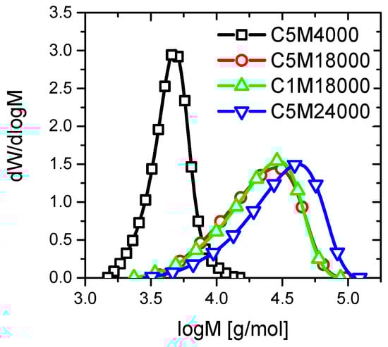 A low amount of RAFT agent during polymerization could justify a slight increment into the polydispersity of C5M24000, C1M18000, and C5M18000 samples (Table 1) because control agents provide narrow polydispersities [25]. Nevertheless, the polydispersities are relatively narrow for all materials owing to RAFT polymerization vs. traditional free radical polymerization.