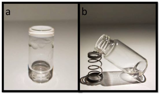 The coil to globule transition can be easily observed visually (Figure 2), where a sample below LCST is a transparent aqueous solution due to hydrogen bonds between polymer–water (Figure 2b), whereas the polymer–polymer interactions increase over LCST and the hydrogen bonds are broken, consequently polymer globules are formed and the sample becomes solid and opaque (Figure 2a) [26]. Moreover, the polymers are shown to have statistical DMA distributions—as expected—because block copolymers tend to form hairy micellar solutions in selective solvents, which likely are often turbid (Figure 2a) [27,28,29,30,31]. Furthermore, it is clear from Figure 2 that the DMA is not oxidized, as this would lead to lead to catechol tanning, which turns the sample dark red after an initial pink hue at very low oxidation levels.